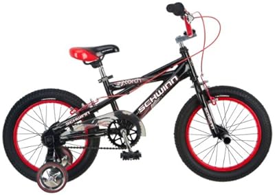 The Schwinn Boy's Scorch BicycleIt's features Sixteen-inch single-speed boy's bike with freestyle, steel frame . Rear coaster brake and front caliper brake . Wide, slick tires; detailed with front pegs . Training wheels, chain guard, and handlebar pad for safety . Recommended for ages three to six . .your can buy lowprice now Click below Choose from store .Save Now Today.