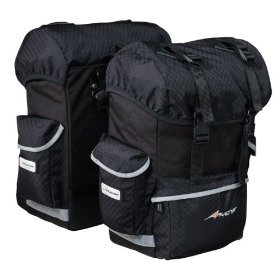 Pair of large bicycle panniers with 1,700 cubic inches of storage space . Tough 600-denier nylon construction with adjustable nylon strap system . Two main compartments with space for water bottles, gear, clothes, and more . Six ripstop nylon outer pockets for smaller items; integrated ripstop nylon covers . Generous reflective stripes for dimly lit days; rear light attachment clips .