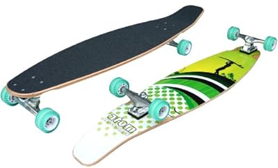 Standard skate trucks made of die-cast aluminum hanger and base, and chromoly axle . It consists of 90A - HR suspension, polycarbonate hubs and 65-Millimeter 78A tires . 7.4-Pound overall weight and 4-Pound deck weight; 39-Inch overall length . 8-Millimeter axle diameter and 8.5-Inch axle width, 39-Inch deck length and 9.4-Inch deck width . 0.375-Inch by 60-Millimeter chromoly king pin, 8 by 22-Millimeter ABEC 5 bearing . 65-Millimeter and 78A urethane wheels, full coverage grip-tape top . Classic Kicktail Longboard . Components 8.5-Inch aluminum trucks, ABEC 5 bearings, maple laminate deck . Components:8.5 inches Aluminum Trucks; Abec 5 Bearings ; Deck - Maple Laminate Deck; 65mm / 78A Urethane Wheels; Full coverage griptape top . Great cruiser longboard with a nice Kicktail .