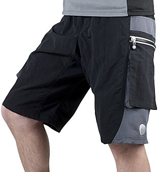 Two shorts in one: padded liner short using our high density, antimicrobial Black Pearl chamois pad in addition to a baggy exterior Nylon shell; great for mountain biking, commuting, and touring . Comfortable, quick drying activewear fabric; goes great with our Men's Rowdy Jerseys . Men's Sizes: S (28-30 in. waist) M (31-33 in. waist) L (34-36 in. waist) XL (37-40 in. waist) 2X (41-43 in. waist) 3X (44-46 in. waist) 4X (47-50 in. waist) . Additional features: 4 pockets (2 with zipper closures), adjustable buckle-clincher waistband, reflective elements, 12 inch inseam (approximately), soft silicone leg grippers on interior short leg openings, stretch fabric panels on exterior shell . Available in 3 colors; made in the USA .
