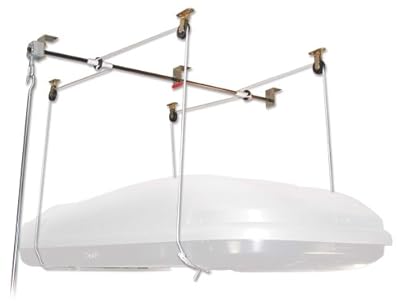 Designed for cargo box removal and storage in garages and workshops . Supports up to 220-lbs (100kg) when installed correctly . One-person use with crank system, lifting cargo boxes on and off vehicles . Mounts quickly and easily to ceiling studs or rafters . Also great for canoes, kayaks, surfboards, sailboards, ladders, etc. .